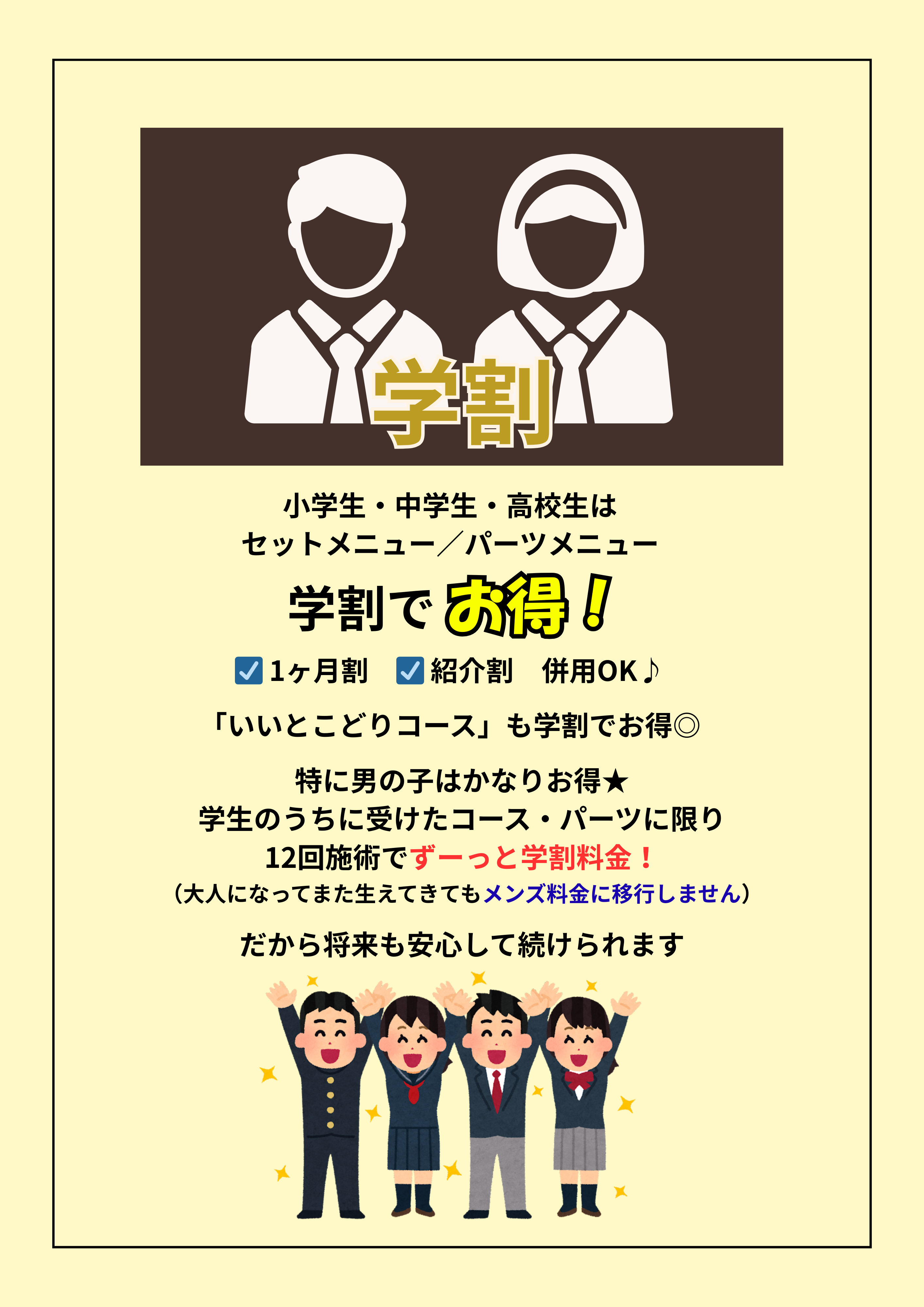 未成年者の方が施術を受ける際は、初回のみ親権者様ご同伴が望ましいですが、ご同伴が難しい場合は、同意書をご持参いただければ、お子様御本人様だけでのご来店も可能です。