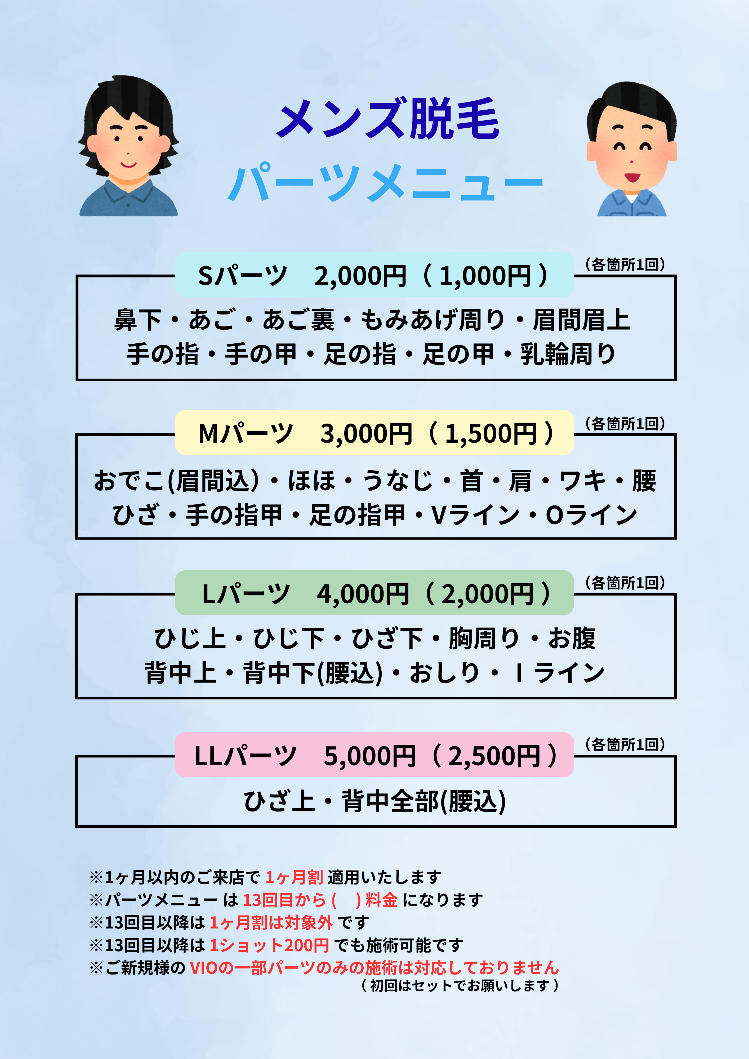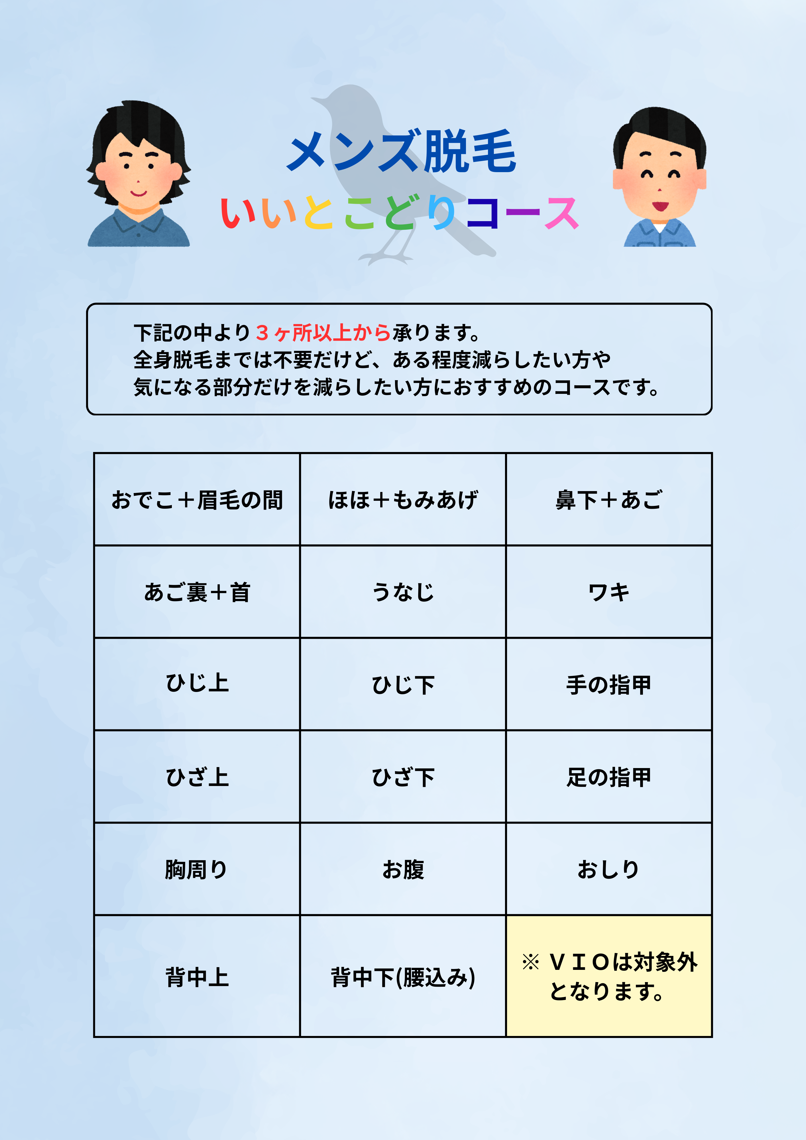 体毛の濃さがコンプレックスになっている男性はとくにオススメ!! 体毛の悩みが減り、外見にも自信を持てるようになります。 髭剃り等のわずらわしさも無くなり、汗やニオイがこもらず清潔な状態を保てるようになります。 また、肌への負担が減り、くすみやシミ、炎症による赤みやかゆみの悩みも減ります。